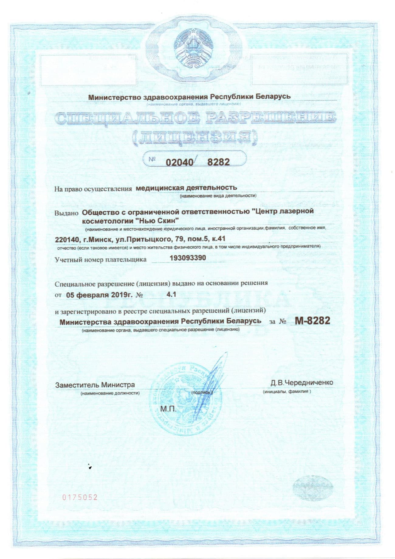 Центр лазерной косметологии «New Skin» работает на основании медицинской лицензии №М -8282 от 05.02.2019 на право осуществления медицинской деятельности в области косметологии (лазерное удаление гемангиом, лазерная эпиляция, лазерная лечение возрастных изменений кожи, рубцов, растяжек, сосудистых новообразований кожи, телеангиоэктазии).